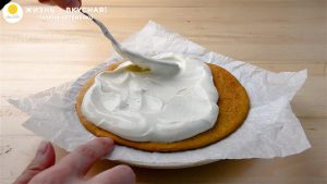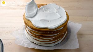 - Переслаиваю коржи сметанным кремом, распределяя крем равномерно. Слой крема будет хорошим, не тонким. Это важно! Иначе “Медовик” не будет таким нежным, как должен.