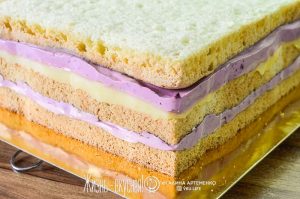 - Уложить второй корж, выложить курд, отправить на 15 минут в холодильник. Затем поверх курда выложить вторую половину мусса.