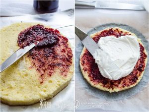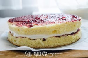 - Смажьте два коржа слоем смородинового джема (количество — сколько уйдет, тут без четких границ).