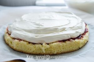 - Готовым кремом перемажьте бисквитные коржи. Не жалейте крема – пусть его будет много.