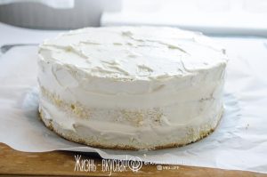 - Верх и бока торта обмажьте совсем немножечко – чисто символически. Уберите заготовку в холодильник на 2-3 часа.