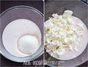 - Сахар смешайте с йогуртом, перемешайте и дайте ему постоять минут 10, чтобы сахар растворился.