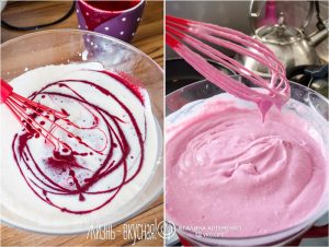 - Добавьте в йогуртовую основу протертую смородину и распущенный желатин.