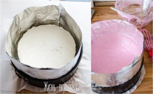 - Если у вас есть кольца, просто установите кольцо на 24 см, дно и бока простелите пленкой. Так как для меня это был дебютный муссовый торт, я соорудила следующее…