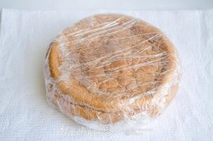 - Заверните его в пищевую пленку и выстаивайте 8 часов. Рекомендуют выстаивать все бисквиты – так с ними легче работать, потому что они хорошо режутся, не крошатся, и не размокают, когда пропитываешь их сиропом.