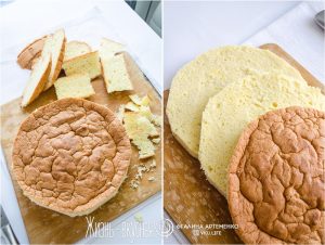 - Готовый выстоявшийся бисквит я обрезала по краям, срезав по 1,5 см по периметру (на тот момент у меня была только одна форма на 24 см, и для выпечки, и для сборки — пришлось изворачиваться). Можно изначально испечь бисквит в кольце 20-22 см бисквит и собирать в кольце на 24.