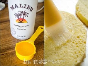 - Бисквитные коржи пропитывают практически всегда, ведь тесто суховатое само по себе. Базовый рецепт сиропа для пропитки – это сахар с водой в соотношении 1:1 (если вам сладко, берите 1:2). Для ароматизации добавляют эссенции, сиропы, ликеры и другой алкоголь. У меня как раз оставалось немного Малибу…
