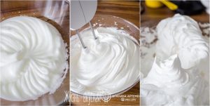 - Белки взбейте в крепкую пену (до мягких пиков).