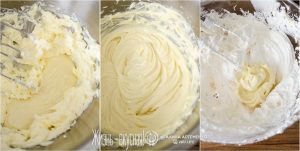 - Сливочное масло комнатной температуры взбейте до пышного состояния. Если взбивать холодное масло, оно свернется.