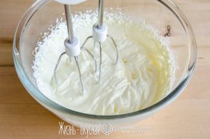 • Затем добавьте к маслу кефирный творожок и взбейте крем до однородности.