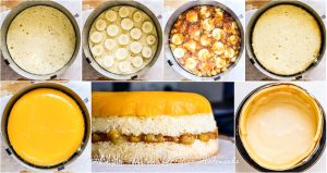 - Проложить форму 22 см плотной пленкой (дно и бока). На дно вылить треть мусса, убрать на 10 минут в морозильник. Уложить внутрь собранный торт вверх дном. Залить бока оставшимся муссом, выровнять поверхность. Убрать в морозильник на 8 часов.