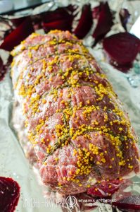 Запекать мясо первые 15 минут при 240°, затем температуру снизить до 150° и печь еще 40-45 минут (15 минут на каждые 500 грамм мяса). В идеале проверяйте температуру внутри куска, чтобы получить желаемую степень готовности. Я люблю medium (60-65° до отдыха), но муж любит полную, поэтому я готовила до полной...