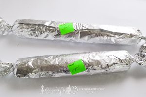 Получившейся массе придайте форму колбаски, плотно оберните ее пищевой пленкой. Я дополнительно завернула еще и в фольгу. Отправьте ваши «салями» в холодильник на ночь. Только не забудьте пометить, где какая =)