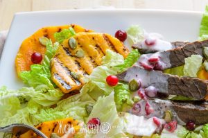 Выложите на тарелки пекинскую капусту, сверху разложите ломтики тыквы. Выложите мясо и полейте его соусом с клюквой. Для красоты посыпьте салат несколькими ягодами клюквы, а для хрустящей текстуры – тыквенными семечками.
