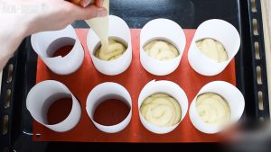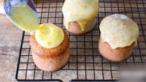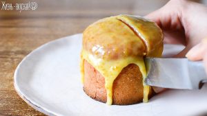 Распределите тесто по формам для выпечки. Выпекайте при 175-180° в течение 25-30 минут. Вы можете выпекать такой кулич как в большой форме, так и в маленьких. В случае в большими куличами их следует выпекать при умеренной температуре в 150° около часа в зависимости от размера или до сухой деревянной шпажки.Готовые куличи полностью остудите, после чего отделайте глазурью. С апельсина снимите цедру и выжмите сок. Добавьте сок в 200 г сахарной пудры и тщательно разотрите массу. Если необходимо, доведите консистенцию глазури до нужной при помощи дополнительной порции сахарной пудры либо горячего молока.