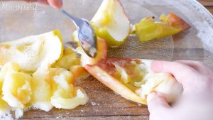 Первым делом необходимо приготовить яблочное пюре. Удалите сердцевину у яблока и разрежьте его на 4 части. Проверьте и удалите все остатки семенной коробочки. Снимать кожицу не нужно.