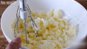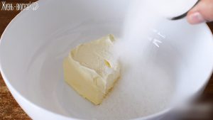 Приступайте к приготовлению теста. К размягченному сливочному маслу всыпьте сахар и взбейте массу до однородности.