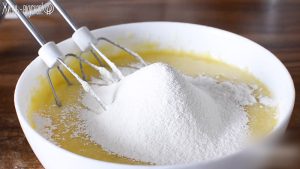 Смешайте муку с разрыхлителем и солью. Просейте эту смесь в жидкую часть теста.