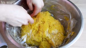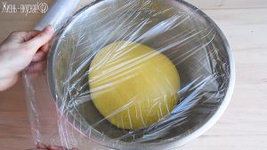 Накройте тесто листом пищевой пленки, чтобы оно не заветривалось, и оставьте для аутолиза на 20 минут. Этим действием мы поможем лучше и быстрее развиться клейковине, а это значит, что замес пойдет быстрее.
