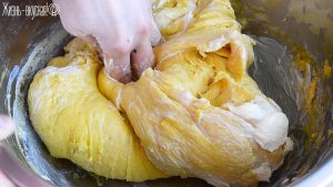 Слегка перемешайте тесто ложкой, а затем лучше продолжить замешивание рукой – так будет удобнее. Тесто будет довольно мягким и липким, но дополнительную муку не подсыпайте.