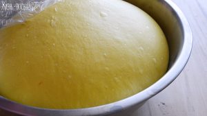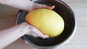 Я не подсыпаю муку на рабочую поверхность – так тесто было очень хорошо замешано и клейковина в нем прекрасно развита, оно не прилипает и очень удобное в работе.