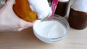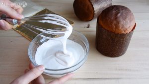 Для глазури я просто смешала белок с сахарной пудрой, чтобы получилась такая вот консистенция. Декорировать можно как в бумажной формочке, так и без нее. Оставлять куличи в формочках удобнее, если вы планируете угостить ими кого-то или транспортировать.