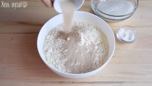 Этим временем приготовьте опару. Для этого вылейте слегка подогретую сыворотку в удобную глубокую миску. Добавьте в сыворотку 3 щепотки соли. Всыпьте треть сахара – не нужно отмерять четко, сыпьте на глаз. Этот сахар станет стартовой пищей для дрожжей.Всыпьте треть от общего объема муки и сухие дрожжи. Я использую уменьшенное количество дрожжей для этих куличей, чтобы тесто бродило вдвое дольше обычных полутора часов, но набрало сильный аромат.