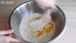 Перемешивайте тесто до тех пор, пока не увидите, что вся мука вошла в него и сухих частей больше не осталось. На этом этапе тесто будет рыхлым и комковатым.