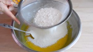 Пришел черед ввести оставшуюся часть муки и замесить тесто. Всыпайте муку в тесто, просеивая при помощи сита.