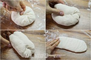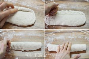 Затем приступайте в формованию багета – это тоже делают по-особенному. Сначала батончик из теста похлопывающими движениями расплющивают в прямоугольную лепешку толщиной около сантиметра. Затем эту лепешку начинают заворачивать, а каждый виток как аккуратно прижимают ребром ладони. Очень важно хорошо, но деликатно прижать край. После этого раскатывайте багет в жгут – у меня это был жгут длиной около 50 см, а вы катайте исходя из размеров вашей духовки.