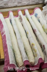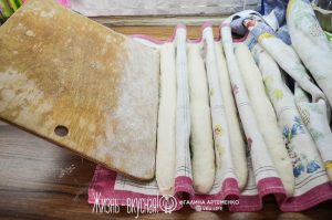 Их чистого льняного полотенца или другого куска ткани соорудите конструкцию, как на фото. Хорошенько припылите полотенце мукой. В получившиеся ложбинки уложите багеты швом вверх и расстаивайте из 30 минут. За это время они начнут расти.