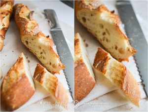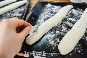Аккуратно переложите багеты на раскаленный противень, сделайте сверху надрезы острым лезвием и отправляйте в духовку на 20-25 минут (ах, эти мучительные 25 минут!..).