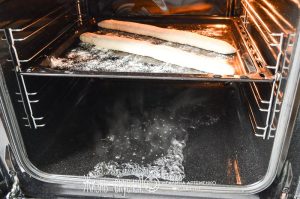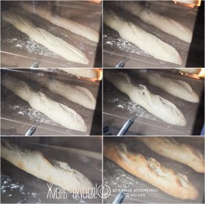 Первые 10 минут нужно печь багеты с паром (для этого просто влейте по чашке кипятка на дно духовки /если она электрическая/ или на пустой противень снизу /если духовка газовая/ на первой и третей минуте выпекания). Будьте осторожны, чтобы не обжечься паром.