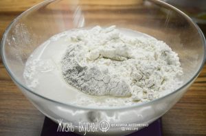 Смешайте муку и ледяную воду, после чего необходимо дать тесту постоять в течение 45 минут. Этот «постоять» называют аутолизом. За это время мука поглощает всю влагу.