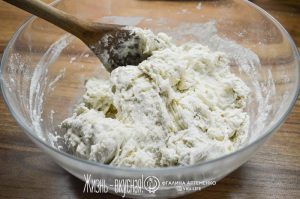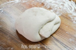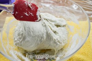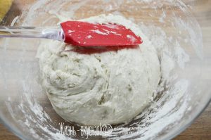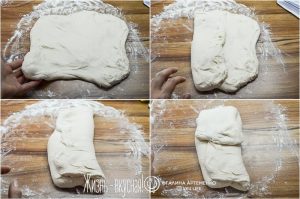 Теперь видно, что тесто поплыло еще больше – так и должно быть. Пришло время его «растянуть-сложить» 1 раз.