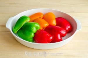 Первым делом нужно подготовить сам перец. Тщательно вымойте его, разрежьте на пополам или на 3 части, удалите плодоножки с семенами.