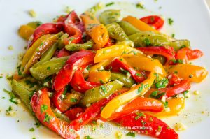 Полейте заправкой ломтики перца с петрушкой и зеленью, и перемешайте. Такой сладкий перец готов к употреблению сразу же.