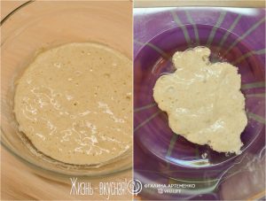 - Смешайте опару с остальными ингредиентами. Тесто не крутое (в следующий раз добавлю немного больше муки). Я месила миксером до тех пор, пока оно не стало формоваться в шарик – развилась клейковина.