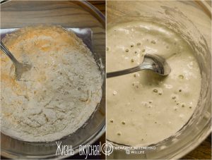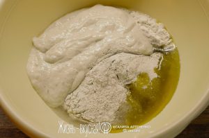 - Распустите стартер в воде, добавьте муку и перемешайте. Накройте пленкой и отправьте опять созревать до пузырчастости и воздушности. Нужно подловить момент, когда опара будет на пике, но еще не будет опадать. У меня на это ушло 3,5 часа в ванной.