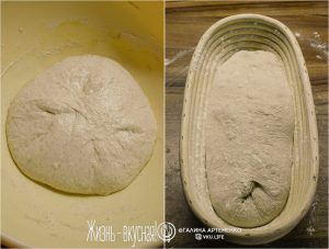 - После этого сформуйте тесто в буханку, уложите в расстоечную форму. Так как я поставила стартер с утра, весь процесс занял у меня весь день и к моменту окончания брожения была полночь. Именно поэтому для роста тесто в форме отправилось в холодильник. Это называется холодным брожением: тесто при температуре 5 градусов продолжает бродить, просто это занимает больше времени – около 18 часов.