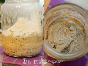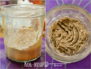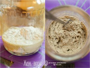 - В банку, где бродила закваска, добавила по 50 грамм воды и цельнозерновой ржаной муки, перемешала, закрыла и убрала обратно в шкафчик.